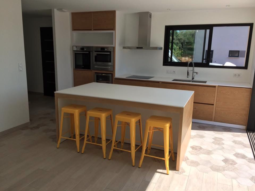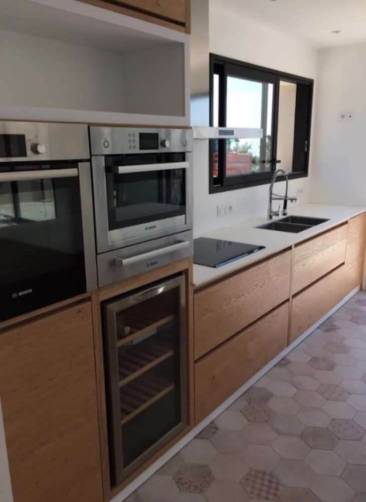 Cette cuisine moderne allie élégance et fonctionnalité avec un design épuré et des matériaux naturels. Parfaite pour un espace lumineux et convivial.