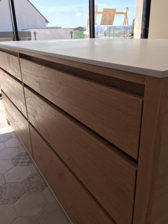 - Meubles en bois clair sans poignées pour un rendu minimaliste