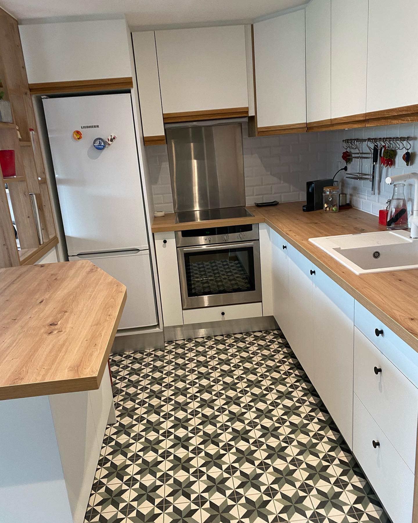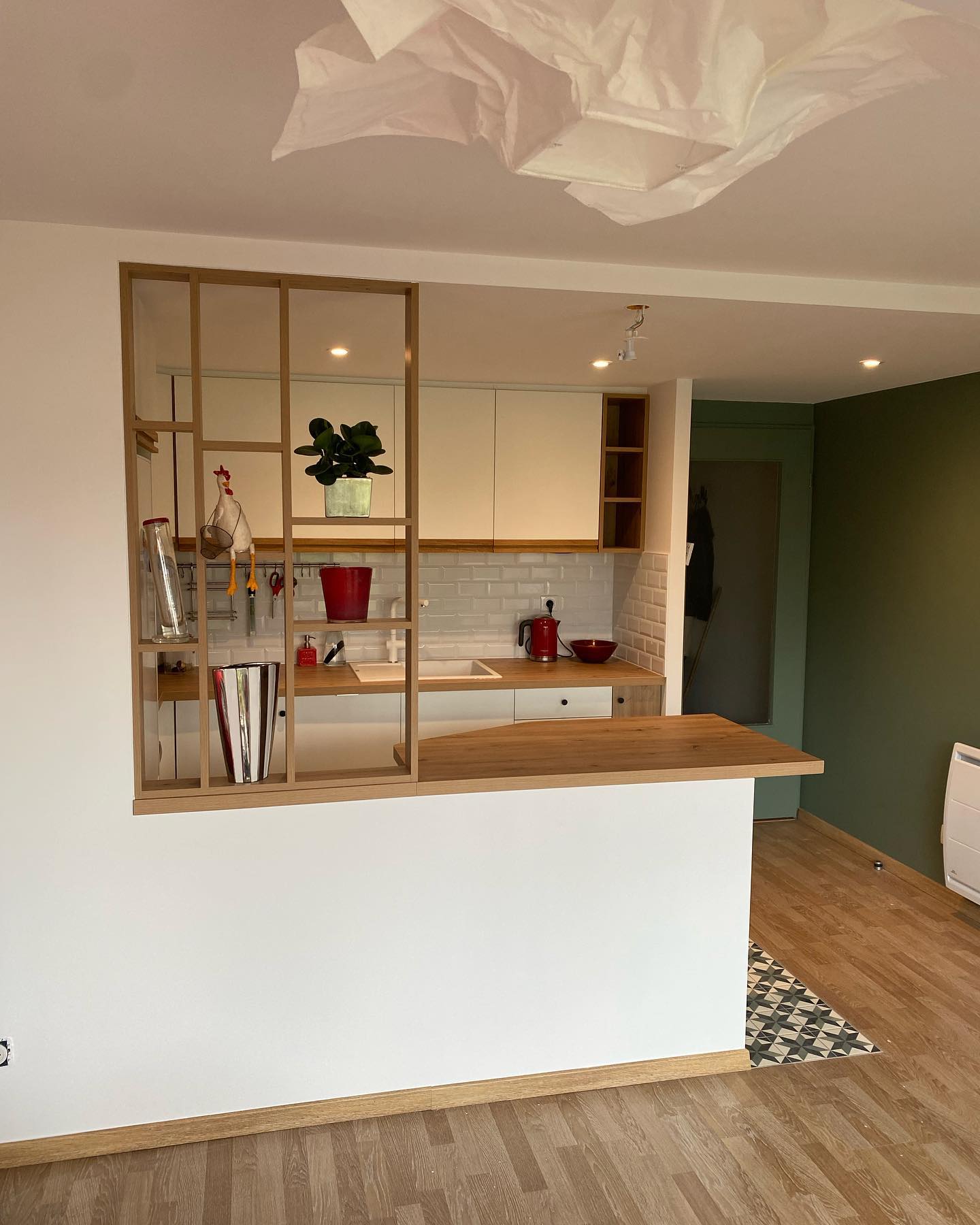 - Cuisine contemporaine alliant bois clair et façades blanches mates