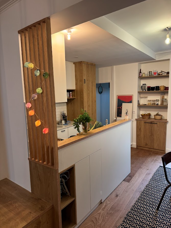 - Bar semi-ouvert avec claustra bois, parfait pour séparer les espaces sans les cloisonner.