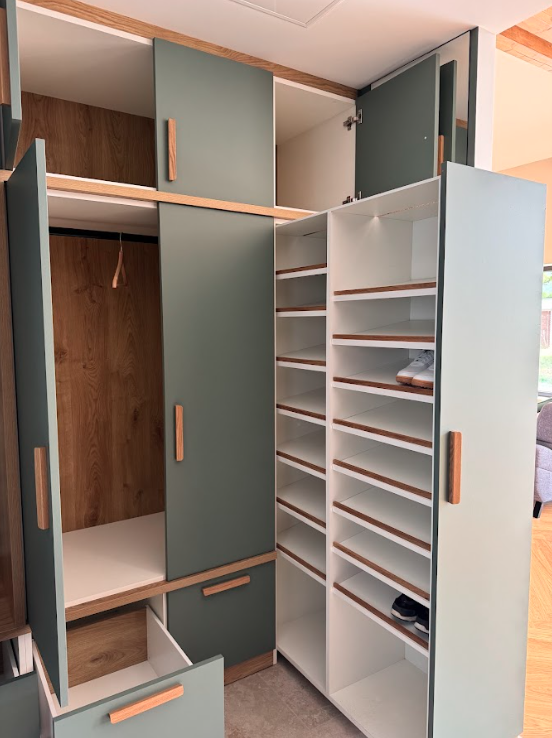 Dressing d’entrée sur mesure réalisé en bois naturel et façades vert sauge.