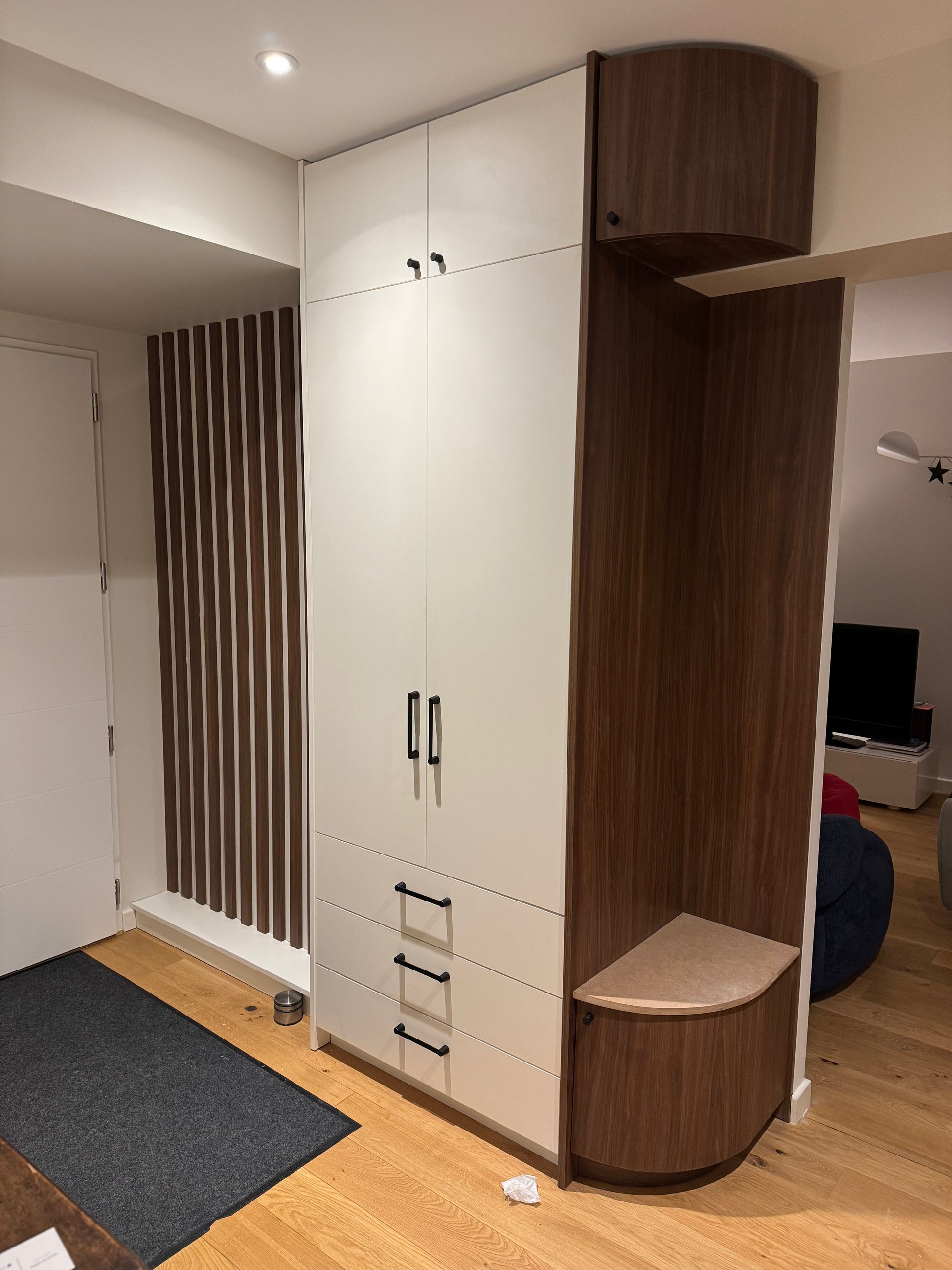 Réalisation d’un meuble d’entrée sur mesure en mélaminé, associant deux décors élégants : blanc et noyer.